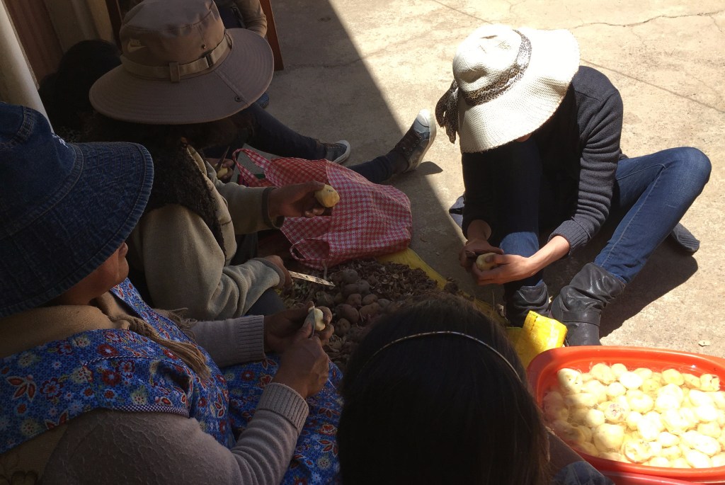 Unsure of what else to do, we sat down to help peel potatoes and sort chuño. Slowly, laughter broke the silence as we worked together. Our limited Spanish brought giggles from the women. The neighbors wielded their knives with impressive speed as I fumbled with mine. We sat together for over an hour, the sun beating down on us, but none of us wanting to move. I said nothing; I just wanted to remain in that moment. Then, I felt a hat being placed on my head. A young woman gently set her hat on me and smiled—a smile I will never forget.